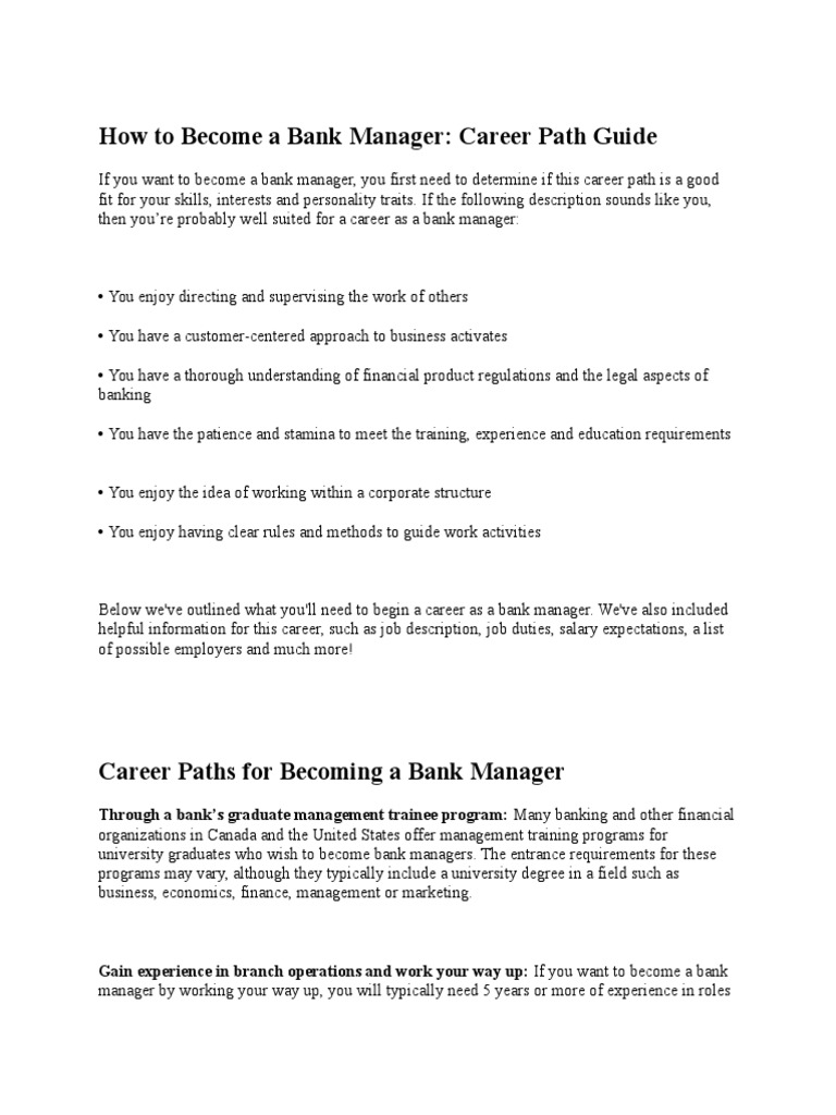 Having good analytical skills, good people skills, a bachelor's degree, and 5 years of financial institution experience. 2 obtaining the necessary qualifications and skills. 1 deciding to become a bank manager. Reason to apply for bank recruitment on guidely? Was the focal point to assist the bank clients, ensuring that they receive the maximum services the bank can offer and are satisfied with services of bank now and in the future.